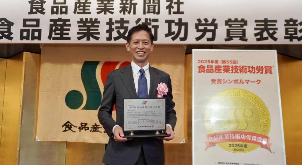 植物性のダシ「MIRA-DashiⓇ」が、食品産業新聞社主催の「第55回 食品産業技術功労賞<商品・技術部門>」を受賞しました。植物性の油脂とたん白の技術を融合し、植物性素材でありながら動物性食品特有の満足感と風味を実現した点が高く評価されました。この取り組みは、食の多様化への対応、人手不足の解消、そして持続可能な食の未来への貢献が期待できることから、今回の受賞につながりました。